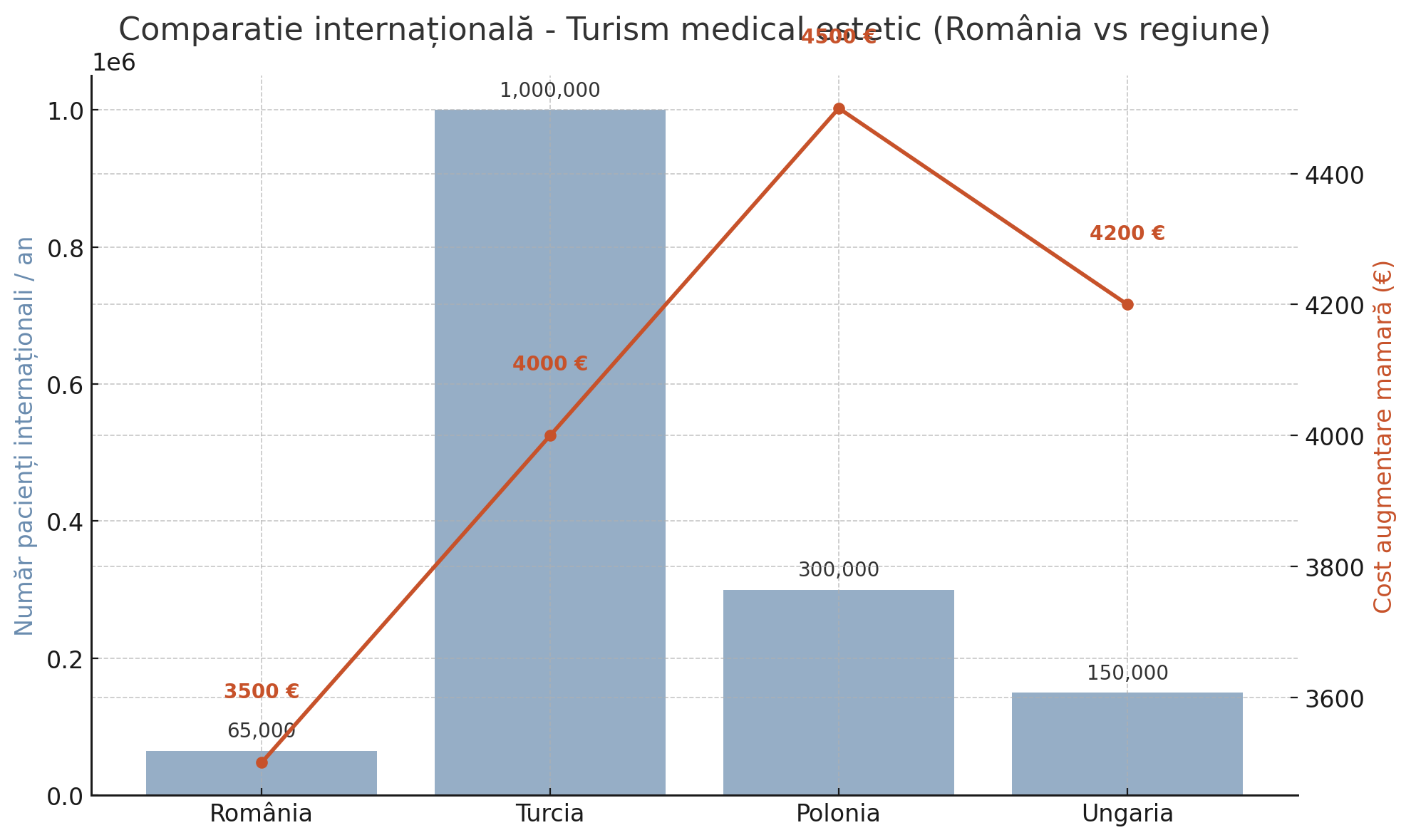 Fenomenul turismului medical estetic nu este unic României. Țări precum Turcia și Polonia atrag anual sute de mii de pacienți străini, generând venituri de peste 1 miliard de euro doar din intervenții chirurgicale estetice (sursa: ISAPS, 2023). Ungaria este de asemenea cunoscută pentru stomatologie și chirurgie estetică, având un flux constant de pacienți vest-europeni.